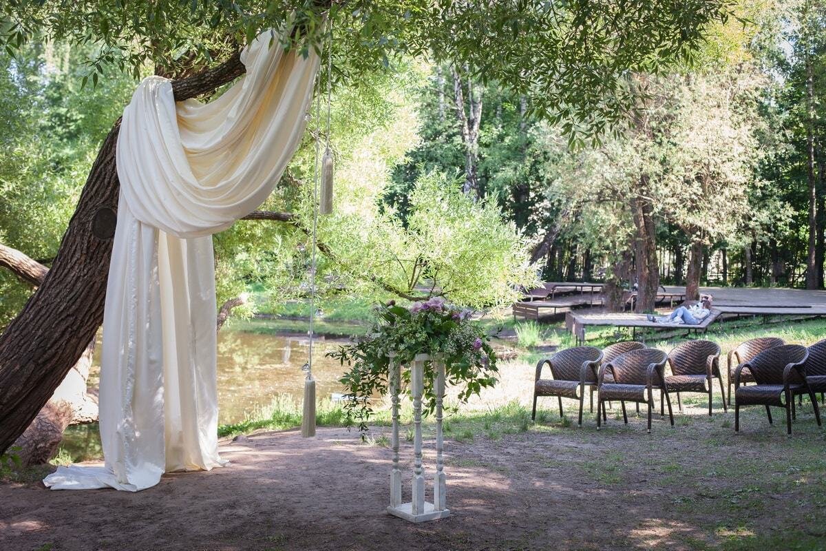 Милана сделала нам красивейшую зону регистрации прямо у пруда и превосходно украсила зал.